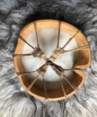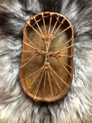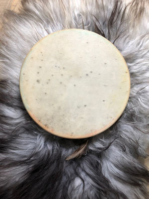 Als zweite Trommel baute ich 2016 ein kleine Trommel aus einer Rehhaut auf einem Cypressenrahmen.