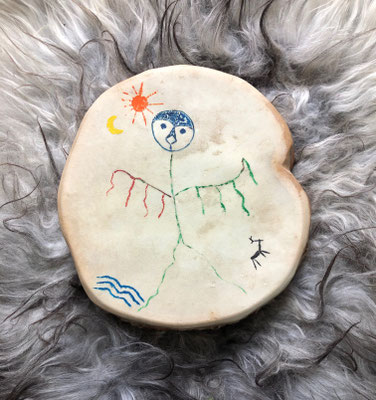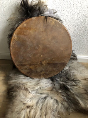 Als 2020 auf der Suche nach der Pferdehaut war, begegnete mir eine Trommelhaut, die eher ein Brett war bzw. eine Scheibe. Die Maserung sprach mich direkt an und da gab es keine Überlegung "das Brett" wollte mit. Eine Büffelhaut knapp 4mm stark. Ich hatte großen Respekt vor dieser Haut und legte sie erst einmal beiseite. Im Spätsommer 2022 erhielt ich den Ruf - "ich will in 2022 geboren werden". Ok, ich ging auf die Suche nach einem Rahmen 55 cm Durchmesser und aus Ahorn. Soweit so gut. In den Rauhnächten sollte es sein. Ich wusste, es kommt eine große Herausforderung auf mich zu. Nicht nur das die Haut so dick und fest ist, nein, der Spirit des Büffels forderte mich heraus. Nach langer Einweichzeit konnte ich die Haut arbeiten und es entstand eine wunderbare Trommel. Danke!