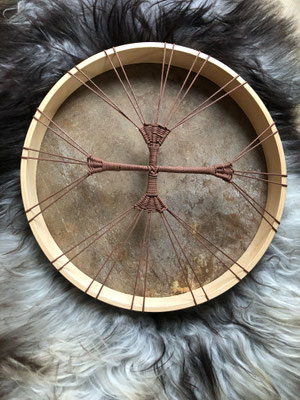Meine Hirschtrommel ist die erste Trommel, die ich gebaut habe. Sie ist auf einem Buchenrahmen gespannt und entstand im Jahr 2014. Sie ist meine treue Begleiterin. Diese wunderbare Trommel klingt auch bei feuchtem Wetter kraftvoll und klar. Sie ist sehr freiheitsliebend. Als ich eine Tasche für sie nähen wollte, nahm ich einen großen Widerstand wahr und so entstand eine Art Netz aus Makramee - einen Sommer lang habe ich daran geknotent.